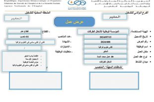 الجمهورية الجزائرية الديمقراطية الشعبية وزارة العمل والتشغيل والضمان الاجتماعي الوكالة الوطنية للتشغيل الملحقة المحلية للتشغيل المغير الفرع الولائي للتشغيل المغير عرض عمل ads الهيئة المستخدمة: ديوان الترقية والتسيير العقاري المنصب: حارس القطاع القانوني: عام عدد المناصب: 02 تاريخ التسجيل: 2024/07/15 رقم العرض: 2024/406 الامتيازات: …