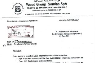 مؤسسة الصيانة الصناعية Wood Group Somias SpA SOCIETE DE MAINTENANCE INDUSTRIELLE ads Direction des ressources humaines Annaba, le 27/06/2024 : d’offre d’emploi. جميع مسابقات وإعلانات التوظيف نوفمبر 2025 إعلان عن مسابقة توظيف بالمعهد التقني لزراعة البقول والزراعات الصناعية بالجزائر العاصمة ووهران سوناطراك تطلق عملية …