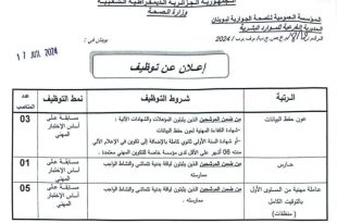 الجمهورية الجزائرية الديمقراطية الشعبية وزارة الصحة المؤسسة العمومية للصحة الجوارية لبوينان المديرية الفرعية للموارد البشرية إعلان عن توظيف ads تعلن المؤسسة العمومية للصحة الجوارية لبوينان البليدة عن فتح مسابقة توظيف على اساس الشهادة في الرتب المبينة في الصور ادناه ملاحظة : تودع الملفات مباشرة …
