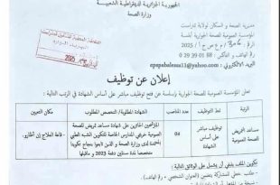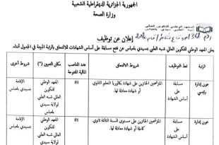 وزارة الصحة مديرية الصحة والسكان لولاية تمنراست المؤسسة العمومية للصحة الجوارية ابلسة ads إعلان عن توظيف تعلن المؤسسة العمومية للصحة الجوارية ابلسة عن فتح توظيف مباشر على أساس الشهادة في الرتب التالية: يتكون الملف ويحتوي على الوثائق التالية: طلب خطي للمشاركة يتضمن (العنوان الشخصي …