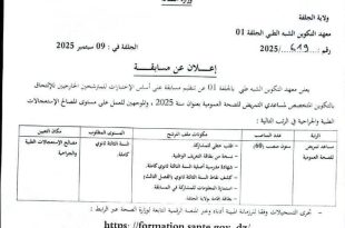 ولاية الحلقة ads يُعلن معهد التكوين شبه الطبي بالحلقة 01 عن تنظيم مسابقة على أساس الإختبارات للمرشحين الخارجيين للإلتحاق معهد التكوين شبه الطبي بالحلقة 01 بالتكوين المتخصص للمساعدي الممرض للصحة العمومية بعنوان سنة 2025، والمؤهلين للعمل على مستوى المصالح الإستعجالات الطبية والجراحية في الرتب …