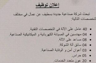 إعلان توظيف ads تبحث شركة صناعية جديدة بسطيف عن عمال في مختلف التخصصات التالية: 40 عامل على الآلة في التخصصات التقنية. 04 مهندسين في الصيانة الكهربائية و الميكانيكية الصناعية. 08 مساعد على الآلة. 04 سائق آلة الشوكة. 03 أعوان أمن و الوقاية الصناعية. 05 …