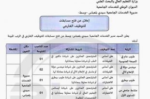 إعلان عن فتح مسابقات للتوظيف الخارجي وزارة التعليم العالي والبحث العلمي الديوان الوطني للخدمات الجامعية مديرية الخدمات الجامعية سيدي بلعباس وسط ads يعلن مدير الخدمات الجامعية سيدي بلعباس وسط عن فتح مسابقات للتوظيف الخارجي في الرتب المبينة أدناه: طبيب عام في الصحة العمومية (01 …