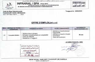 أكمل القراءة »عرض عمل مستعجل بمؤسسة INFRARAIL/SPA