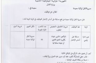 وزارة النقل مديرية النقل لولاية سعيدة ads إعلان عن توظيف تعلن مديرية النقل لولاية سعيدة عن فتح مسابقة على أساس الإختيار للتوظيف في الرتبة المبينة أدناه: الرتبةنمط التوظيفشروط الإلتحاق+التخصص المطلوبعدد المناصب المالية المفتوحةمكان التوظيفشروط أخرىعون إدارة رئيسيمسابقة على أساس الإختيارالمترشحين الحائزين شهادة بكالوريا التعليم …