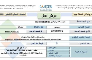 الفرع الولائي للتشغيل جيجل الملحقة المحلية للتشغيل الظاهير ads عرض عمل الجهة المستخدمة المؤسسة الميدانية جن جن القطاع القانوني عمومي تاريخ تسجيل العرض 02/09/2025 عدد المناصب 01 في كل عرض مكان العمل ميناء جن جن المناصب: تقني سامي / ليسانس في الإعلام الآلي “أنظمة …
