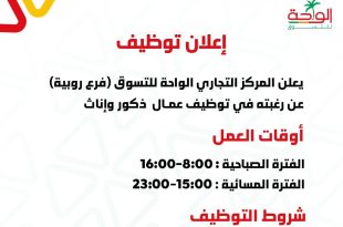 إعلان توظيف ads يعلن المركز التجاري الواحة للتسوق (فرع الرويبة) عن رغبته في توظيف عمال ذكور وإناث. أوقات العمل الفترة الصباحية: 8:00-16:00 الفترة المسائية: 15:00-23:00 شروط التوظيف التمتع بحالة صحية جيدة الالتزام بالمهام الموكلة من طرف الإدارة يفضل وجود خبرة سابقة لكنها ليست شرط …