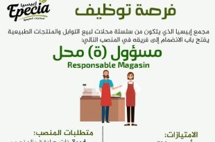 Epecia للمنتجات الطبيعية فرصة توظيف ads مجمع إبيسيا الذي يتكون من سلسلة محلات لبيع التوابل والمنتجات الطبيعية يفتح باب الانضمام إلى فريقه في المنصب التالي: مسؤول(ة) محل Responsable Magasin الامتيازات: أجرة محفزة. منحة تقييم مرتبطة بالأداء. فرص التكوين والترقية. جو عمل شبابي. متطلبات المنصب: …