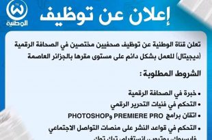 ads إعلان عن توظيف قناة الوطنية TV تعلن قناة الوطنية عن توظيف صحفيين مختصين في الصحافة الرقمية (ديجيتال) للعمل بشكل دائم على مستوى مقرها بالجزائر العاصمة. الشروط المطلوبة: خبرة في الصحافة الرقمية. التحكم في فنيات التحرير الرقمي. إتقان برامج PHOTOSHOP و PREMIERE PRO. التحكم …