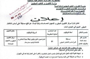 وزارة التكوين و التعليم المهنيين مركز التكوين المهني و التمهين الحمامات ads إعـــلان تعلن إدارة مركز التكوين المهني و التمهين الحمامات ولاية تبسة، عن فتح مسابقة على أساس الإختبار المهني المبين أدناه: منصب الشغل: حارس غير محدد المدة بالتوثيق الكامل نمط التوظيف: مسابقة على …