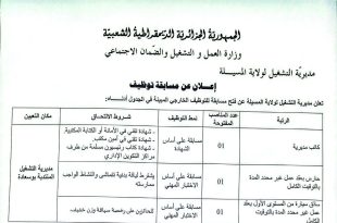 وزارة العمل و التشغيل و الضمان الاجتماعي مديرية التشغيل لولاية المسيلة ads إعلان عن مسابقة توظيف تعلن مديرية التشغيل لولاية المسيلة عن فتح مسابقة للتوظيف في المناصب المبينة في الجدول أدناه: الرتبةعدد المناصب المفتوحةنمط التوظيفشروط الالتحاقمكان التعيينكاتب مديرية01مسابقة على أساس الشهادة– شهادة تقني في …