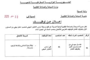 وزارة السياحة والصناعة التقليدية ولاية المسيلة مديرية السياحة والصناعة التقليدية ads إعلان عن توظيف تعلن مديرية السياحة والصناعة التقليدية لولاية المسيلة عن فتح مسابقة على أساس الإختيار المهني لمنصب: عامل مهني من المستوى الأول بالتوقيت الكامل للتوظيف الخارجي، للالتحاق بمنصب محدد في الجدول أدناه: …