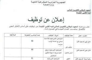 وزارة الصحة المعهد الوطني للتكوين العالي شبه الطبي للبليدة ads إعلان عن توظيف تعلن إدارة المعهد الوطني للتكوين العالي شبه الطبي للبليدة عن توظيف على أساس الاختبار المهني للالتحاق بمناصب الشغل المبينة في الجدول أدناه. المنصب عملنمط التوظيفشروط التوظيفعدد المناصب المفتوحةالملاحظةعامل مهني المستوى الأولتوظيف …