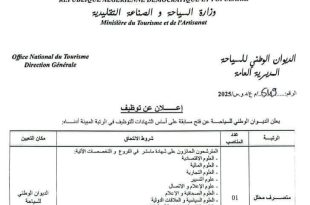 وزارة السياحة والصناعة التقليدية الديوان الوطني للسياحة المديرية العامة ads إعلان عن توظيف يعلن الديوان الوطني للسياحة عن فتح مسابقة على أساس الشهادات للتوظيف في الرتبة المبينة أدناه: الرتبةعدد المناصبشروط الالتحاقمتصرف محلل01الحائزون على شهادة ماستر في الفروع والتخصصات الآتية:<ul><li>العلوم الاقتصادية، العلوم التجارية، علوم التسيير.</li><li>العلوم …