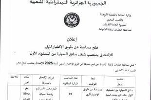 وزارة الفلاحة والتنمية الريفية والصيد البحري المديرية العامة للغابات محافظة الغابات لولاية الأغواط ads إعلان عن فتح مسابقة عن طريق الإختبار المهني للإلتحاق بمنصب شغل سائق السيارة من المستوى الأول تعلن محافظة الغابات لولاية الأغواط عن فتح مسابقة عن طريق الإختبار المهني لسنة 2025 …