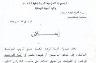 وزارة التربية الوطنية مديرية التربية لولاية البليدة مصلحة المستخدمين ads إعــــــلان تعلم مديرية التربية لولاية البليدة جميع خريجي الجامعات الحاصلين على شهادة الماجستير أو شهادة ماستر في اللغة الفرنسية الراغبين في التوظيف عن طريق التعاقد على مناصب شاغرة في الطور الثانوي كأستاذ لمادة اللغة …