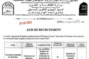 أكمل القراءة »اعلان عن توظيف بالمعهد الجهوي للتكوين الموسيقي لولاية وهران