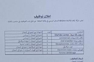 اعلان توظيف شركة BEGAA AUTO JAC ads تعلن شركة BEGAA AUTO JAC الممثل الرسمي في ولاية الجلفة عن فتح باب التوظيف في مناصب التالية :مسؤول (ة) مبيعات Chef des ventesالخبرة فى المجال / ليسانسمكلف (ة) مبيعات commercialالخبرة فى المجال / ليسانسمسؤول ورشة chef d’atellierالخبرة …