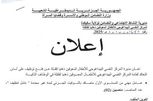 وزارة التضامن الوطني و الأسرة و قضايا المرأة مديرية النشاط الإجتماعي و التضامن لولاية سكيكدة المركز النفسي البيداغوجي للأطفال المعوقين ذهنيا بفلفلة ads إعلان تعلن مديرة المركز النفسي البيداغوجي للأطفال المعوقين ذهنيا فلفلة عن فتح توظيف على أساس التعاقد لفائدة المركز النفسي البيداغوجي للأطفال …