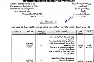 وزارة الفلاحة والتنمية الريفية والصيد البحري مديرية المصالح الفلاحية ولاية ميلة ads إعلان توظيف تعلن مديرية المصالح الفلاحية لولاية ميلة عن فتح مسابقة توظيف على أساس الشهادة في الرتب المبينة أدناه: الرتبةنمط التوظيفالمنصب المطلوبعدد المناصب المالية المفتوحةمكان التعيينشروط أخرىتقني في الإعلام الآليعلى أساس الشهادة– …