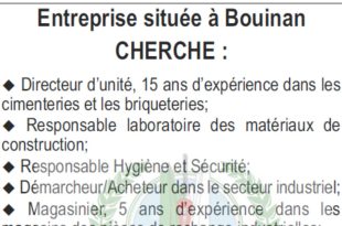 اعلان توظيف ads شركة تقع في بوعينان بولاية البليدة تبحث عن : مدير وحدة، خبرة 15 سنة في معامل الإسمنت والطوب؛ مسؤول مخبر مواد البناء؛ مسؤول النظافة والأمن؛ مكلف بالشراء/مقتني في القطاع الصناعي؛ أمين مخزن، خبرة 5 سنوات في مخازن قطع الغيار الصناعية؛ رئيس …