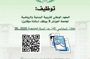إعلان توظيف الأساتذة بالمعهد الوطني للتربية البدنية والرياضية جامعة الجزائر 3 ads تعلن إدارة معهد التربية البدنية والرياضية جامعة الجزائر 3 جميع الأساتذة حاملي شهادة الماجستير او الدكتوراه إمكانية الترشح للتوظيف كآساتذة مؤقتيين للمقاييس التالية:الاعلام الرياضي وتسيير الأزماتالإحصاء الإستدلاليالإحصاء التطبيقيتصميم الحملات الإعلامية الرياضيةنظريات الإعلام …