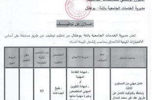 اعلان عن توظيف مديرية الخدمات الجامعية باتنة بوعقال ads تعلن مديرية الخدمات الجامعية لولاية باتنة بوعقال عن فتح مسابقة توظيف في الرتب المبينة ادناه عامل مهني من المستوى الثالث عدد المناصب 03 منصب نمط التوظيف: مسابقة على اساس الاختبارات المهنية حارس عدد المناصب 02 …
