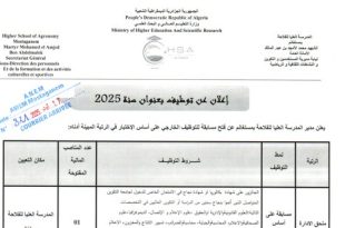 وزارة التعليم العالي والبحث العلمي المديرية الفرعية للمستخدمين ads إعلان عن مسابقة توظيف لسنة 2025 تعلن المدرسة العليا للأساتذة – بوزريعة – عن تنظيم مسابقة على أساس الشهادات للإلتحاق بسلك الأساتذة المساعدين رتبة أستاذ مساعد وفقا لشروط والضائط التوظيف المبينة في الجدول الملحق بهذا …