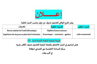 إعلان ads يعلن الفرع الولائي للتشغيل تندوف عن توفر مناصب العمل التالية: المنصب المطلوبالشروط المطلوبةالملاحظاتcadre commercialDiplôme licence sciences : Economique – commerce – gestionBonne maîtrise de l’outil informatiqueExpérience de cinq ans أو plus dans le domaine. بالهيئة الوطنية للرقابة التقنية للبناء CTC فعلى الراغبين …