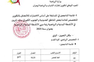 وزارة الرياضة المعهد الوطني لتكوين اطارات الشباب والرياضة بوهران اعلان القائمة النهائية للناجحين في المسابقة على اساس الاختبارات للالتحاق بالتكوين المتخصص برتبة مربي الانشطة البدنية والرياضية. ads 1- قائمة الناجحين في المسابقة على أساس الاختبارات للالتحاق بالتكوين المتخصص لفائدة بعض المناطق الحدودية و الجنوب …