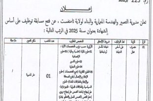 أكمل القراءة »اعلان عن توظيف في مديرية التعمير والهندسة المعمارية والبناء لولاية تامنغست