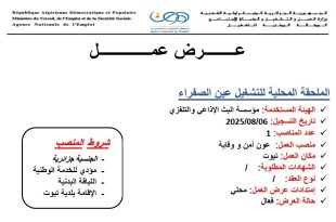 وزارة العمل والتشغيل والضمان الاجتماعي الوكالة الوطنية للتشغيل الفرع الولائي للتشغيل ان قزام الملحقة المحلية للتشغيل – تينزواتين عرض عمل ads المؤسسة: SARL P.S.G المنصب المطلوب: أعوان أمن وحماية عدد المناصب: 10 تاريخ العرض: 04 اوت 2025 مدة صلاحية العرض: 3 أيام الشروط المطلوبة: …