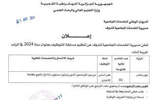 ads إعلان توظيف الجمهورية الجزائرية الديمقراطية الشعبية وزارة التعليم العالي والبحث العلمي الديوان الوطني للخدمات الجامعية مديرية الخدمات الجامعية تندوف تعلن مديرية الخدمات الجامعية تندوف عن تنظيم مسابقة للتوظيف بعنوان سنة 2024 في الرتب المبينة أدناه: شروط الالتحاق والتخصصات المطلوبة الرتبةنمط التوظيفالماليةشروط الالتحاقالتخصصات المطلوبةعدد …