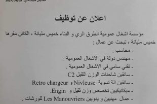 اعلان عن توظيف بمؤسسة اشغال عمومية الطرق الري و البناء