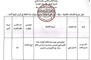 اعلان عن توظيف جامعة حسيبة بن بوعلي الشلف ads تعلن جامعة حسيبة بن بوعلي بولاية شلف عن فتح مسابقة توظيف في الرتب المبينة ادناه استاذ مساعد قسم ب عدد المناصب 36 نمط التوظيف: على اساس الشهادة اليكترونيك 02 اوتوماتيك 02 هندسة ميكانيكية 02 هندسة …
