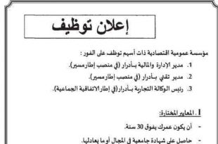 إعلان توظيف ads مؤسسة عمومية اقتصادية ذات أسهم توظف على الفور : مدير الإدارة والمالية بأدرار (في منصب إطار مسير). مدير تقني بأدرار (في منصب إطار مسير). رئيس الوكالة التجارية بأدرار ( في إطار الاتفاقية الجماعية). المعايير المختارة أن يكون عمرك يفوق 30 سنة. …
