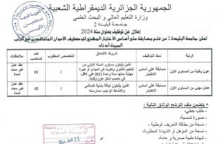 أكمل القراءة »إعلان عن توظيف بجامعة البليدة 2 لونيسي علي