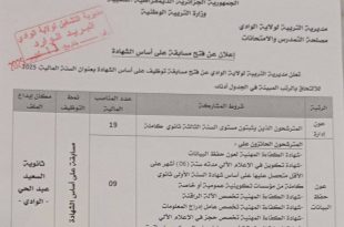وزارة التربية الوطنية مديرية التربية لولاية الوادي مصلحة التمدرس والامتحانات ads إعلان عن فتح مسابقة على أساس الشهادة تعلن مديرية التربية لولاية الوادي عن فتح مسابقة توظيف على أساس الشهادة وعنوان السنة المالية 2025 للالتحاق بالرتب المبينة في الجدول أدناه: الرتبةعدد المناصب الماليةنمط التوظيفمكان …