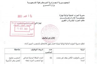 اعلان عن توظيف مديرية الموارد المائية لولاية تيبازة ads تعلن مديرية الموارد المائية لولاية تيبازة عن فتح مسابقة توظيف على اساس الاختبار المهني في الرتب المبينة ادناه حارس عدد المناصب 03 منصب نمط التوظيف: مسابقة على اساس الاختبار المهني ملف المسابقة على أساس الشهادة …