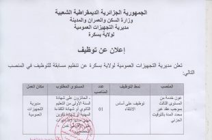 أكمل القراءة »اعلان عن توظيف بمديرية التجهيزان العمومية لولاية بسكرة