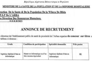 اعلان عن توظيف المؤسسة العمومية للصحة الجوارية الاربعاء البليدة ads تعلن المؤسسة العمومية للصحة الجوارية الاربعاء البليدة عن فتح مسابقة توظيف في الرتب المبينة ادناه مهندس دولة في الاعلام الالي عدد المناصب 01 منصب نمط التوظيف: مسابقة على اساس الشهادة ملف المسابقة على أساس …