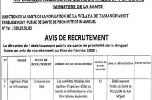 اعلان عن توظيف المؤسسة العمومية للصحة الجوارية امقل تمنراست ads تعلن المؤسسة العمومية للصحة الجوارية امقل تمنراست عن فتح مسابقة توظيف في الرتب المبينة ادناه مهندس دولة في الاعلام الالي عدد المناصب 01 منصب نمط التوظيف: مسابقة على اساس الشهادة ملف المسابقة على أساس …