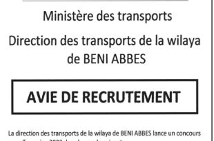 اعلان توظيف مديرية النقل لولاية بني عباس ads تعلن مديرية النقل لولاية بني عباس عن فتح مسابقة توظيف على اساس الشهادة في الرتب المبينة في الصور ادناه ملف المسابقة على أساس الشهادة طلب خطي يتم تضمين به كل من ( رقم الهاتف، العنوان، البريد …
