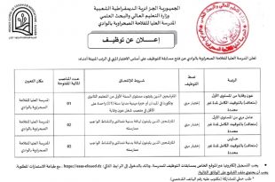 اعلان عن توظيف المدرسة العليا للفلاحة الصحراوية بالوادي ads تعلن المدرسة العليا للفلاحة الصحراوية بالوادي عن فتح مسابقة توظيف في الرتب المبينة ادناه عون وقاية من المستوى الأول عدد المناصب 01 منصب مط التوظيف: على اساس الاختبار المهني عامل مهني من المستوى الأول بالتوقيت …