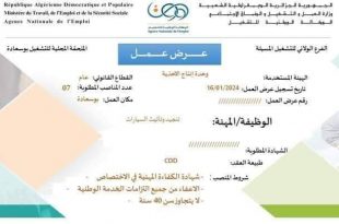 الفرع الولائي للتشغيـل المسيلة الملحقة المحلية للتشغيل بوسعادة عرض عمل وحدة انتاج الاحذية ads تعلن الملحقة المحلية للتشغيل بوسعادة عن عرض عمل بوحدة انتاج الاحذية كما هو موضح ادناه الهيئة المستخدمة: وحدة انتاج الاحذية المناصب المطلوبة: الخياطة عدد المناصب: 10 تاجيد وتاثيث السيارات عدد …
