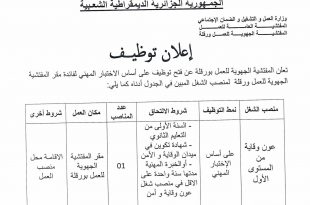 اعلان عن توظيف المفتشية الجهوية للعمل بورقلة ads يعلن المفتشية الجهوية للعمل بورقلة عن فتح مسابقة توظيف في الرتب المبينة ادناه عون وقواية من المستوى الاول عدد المناصب 01 منصب نمط التوظيف: مسابقة على اساس الاختبار المهني ملف مسابقة على اساس الاختبار : طلب …
