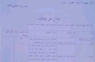 اعلان عن توظيف المديرية الجهوية للأملاك الوطنية بولاية وهران ads تعلن المديرية الجهوية للأملاك الوطنية بولاية بوهران عن فتح مسابقة توظيف بالولايات التالية : وهران عين تموشنت معسكر ومستغانم في الرتب المبينة ادناه عون وقاية من المستوى الأول- عقد غير محدد المدة بالتوقيت الكامل …
