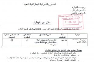 اعلان عن توظيف بلدية حجرة النص ولاية تيبازة ads تعلن بلدية حجرة النص ولاية تيبازة عن فتح مسابقة توظيف في الرتب المبينة ادناه حارس عدد المناصب 01 منصب نمط التوظيف: مسابقة على اساس الانتقاء تاريخ نشر الاعلان: 11 جانفي 2024 اخر اجل لايداع الملفات …