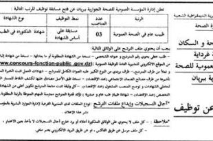 اعلان عن توظيف المؤسسة العمومية للصحة الجوارية بريان بولاية غرداية ads تعلن المؤسسة العمومية للصحة الجوارية بريان بولاية غرداية عن فتح مسابقة توظيف في الرتب المبينة ادناه طبيب عام في الصحة العمومية عدد المناصب 03 منصب مط التوظيف: على اساس الشهادة ملف المسابقة على …