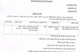اعلان عن توظيف بلدية مداوروش ولاية سوق اهراس ads تعلن بلدية مداوروش ولاية سوق اهراس عن فتح مسابقة توظيف في الرتب المبينة ادناه عامل مهني من المستوى الاول غير محدد المدة بالتوقيت الكامل عدد المناصب 01 منصب مط التوظيف: على اساس الاختبار المهني سائق …